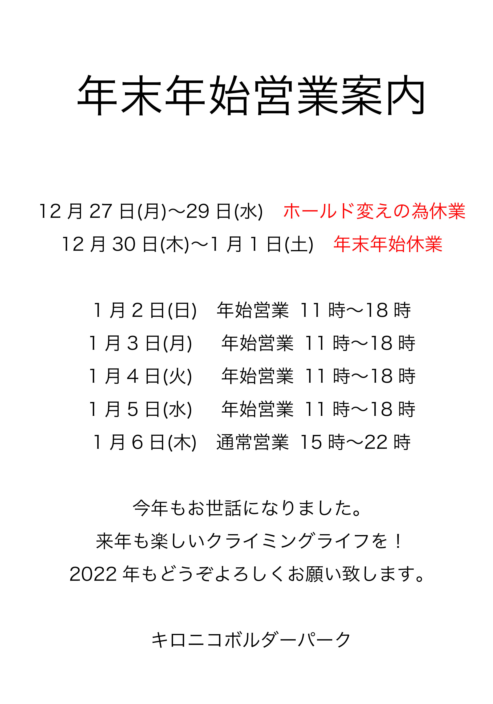 まずは年末年始の営業時間の告知です。ご利用のお客様はご確認の上、ご来店お待ちしております。